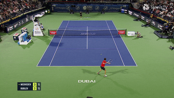 3. Всем прекрасно известно, насколько страшен медведевский бэкхенд – за счет стабильности, глубины и умения направлять мяч в неудобные точки. В финале все это работало просто великолепно. Даниил слева играл так, что Рублев иногда даже не представлял, чего ожидать – например, тут он изначально дернулся не в ту сторону.
