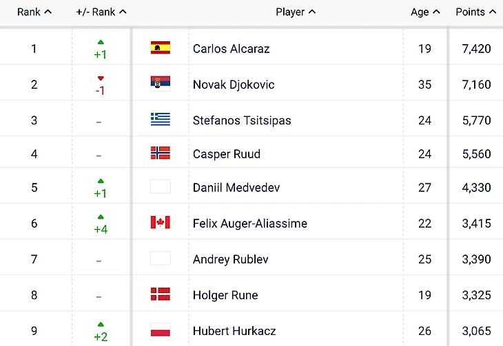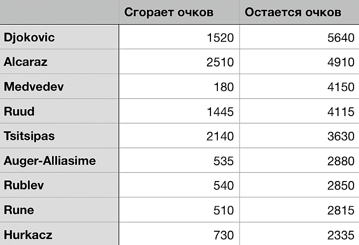 Из значимых преимуществ Медведева - это малое количество очков, которые нужно защищать. Даниил пропустил прошлогодний грунтовый сезон и поэтому за период до 29 мая, когда начнется Ролан Гаррос, у него сгорит только 180 баллов. У ближайшего конкурента - в 3 раза больше! А Алькарас и Циципас потеряют больше 2000 очков каждый. Если за следующие 10 недель теннисисты вообще не наберут очков, то Медведев расположится на 3 строчке, а рейтинг будет выглядеть следующим образом: