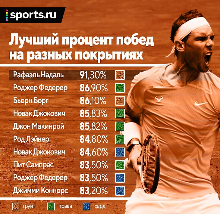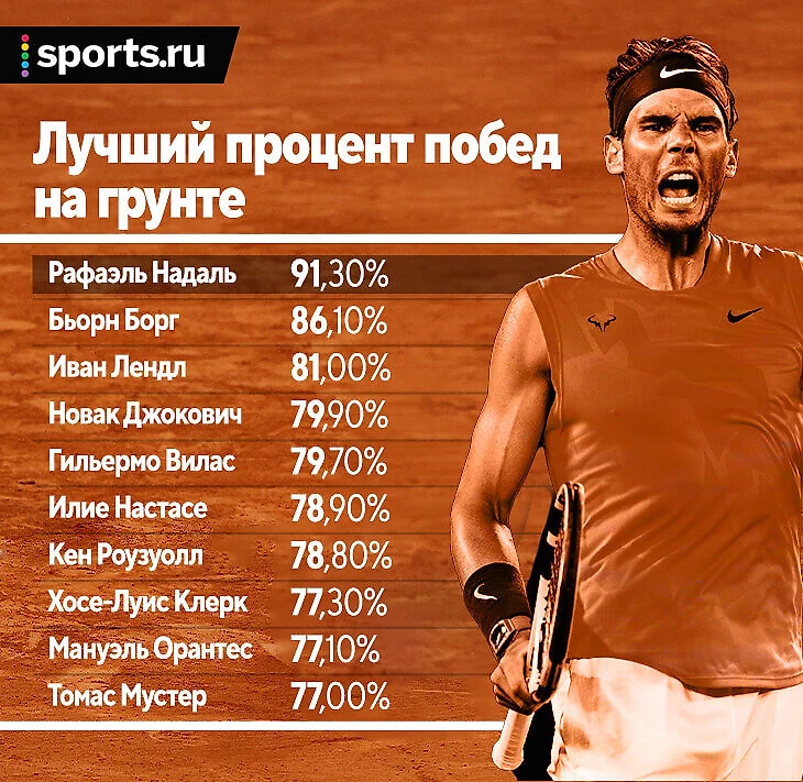 По количеству выигранных матчей на грунте Надаль занимает всего третье место в истории.
