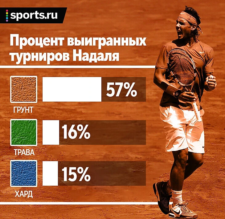 У Рафы очень приличный процент выигранных турниров и на харде, и на траве, но на грунте – вообще запредельный.