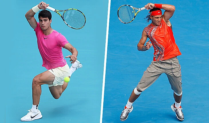 Совсем легким сравнение Алькараса и Надаля делают и внешние сходства. Они оба испанцы, оба с развитой мускулатурой, оба очень любят крутить мяч, и на фотографиях выхода из удара все вообще иногда выглядит одинаково.