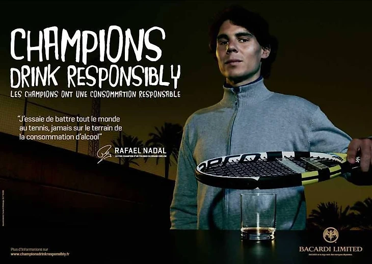 В резюме Рафаэля Надаля рекламных контрактов тоже предостаточно: Kia, Richard Mille, Armani. В 2011 году этот список пополнила компания Bacardi – производитель знаменитого рома, а также других напитков разной степени убойности. Общественность по своему обыкновению поторопилась с выводами и вздернула бровь – что это за спортсмен, рекламирующий алкоголь. Надалю даже пришлось объяснять, что он стал лицом не самой компании, а ее социальной инициативы за ответственное потребление алкоголя (которую до него представлял Михаэль Шумахер). На одном из плакатов Надаль теннисной ракеткой прикрывает стакан, и приведены его слова: «Я всегда показываю своим друзьям, где линия». На втором Рафа, перед которым стоит полупустой стакан, жестом изображает знак «тайм-аут» и как бы говорит: «Я стремлюсь победить всех, когда играю в теннис, а не когда выпиваю». Никакого ущерба для репутации.