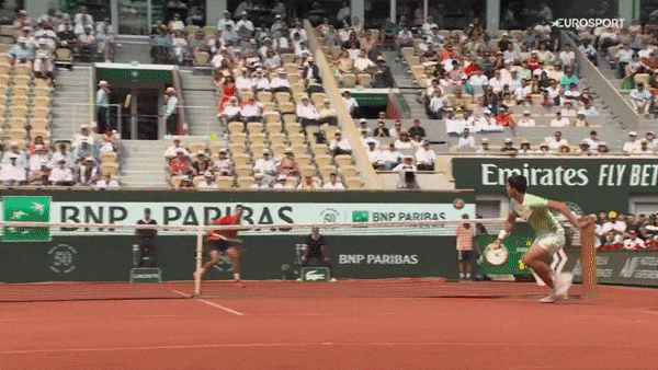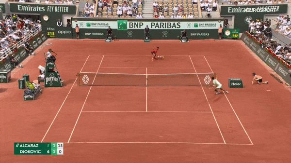 Карлос Алькарас славится умением забивать совершенно невероятные удары из тяжелых положений. И в полуфинале «Ролан Гаррос» против Новака Джоковича он снова его продемонстрировал.