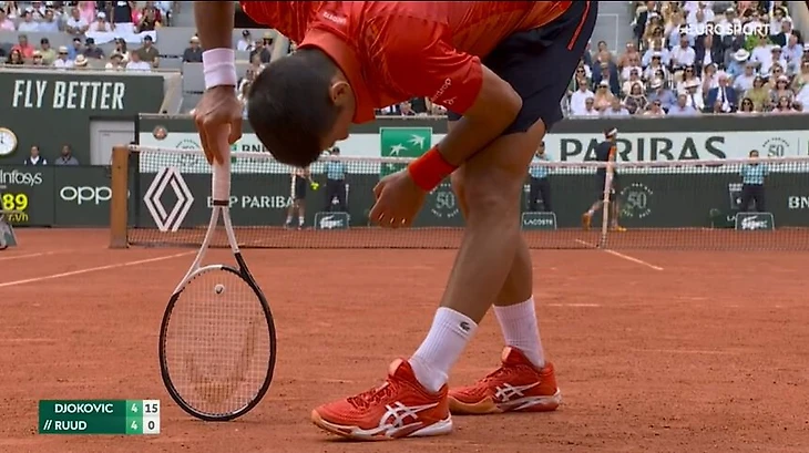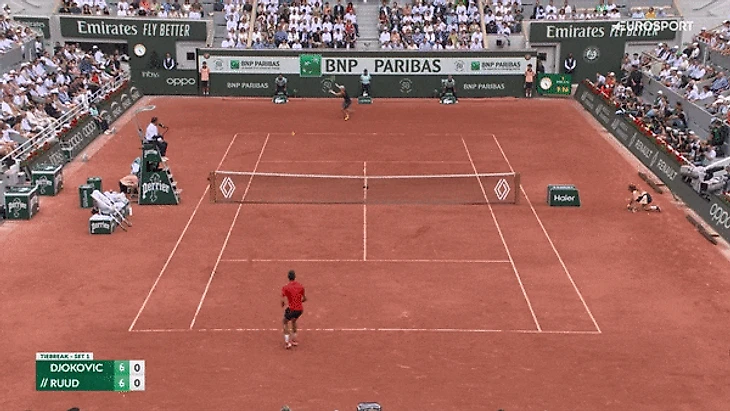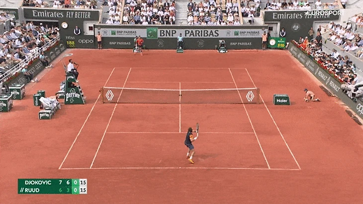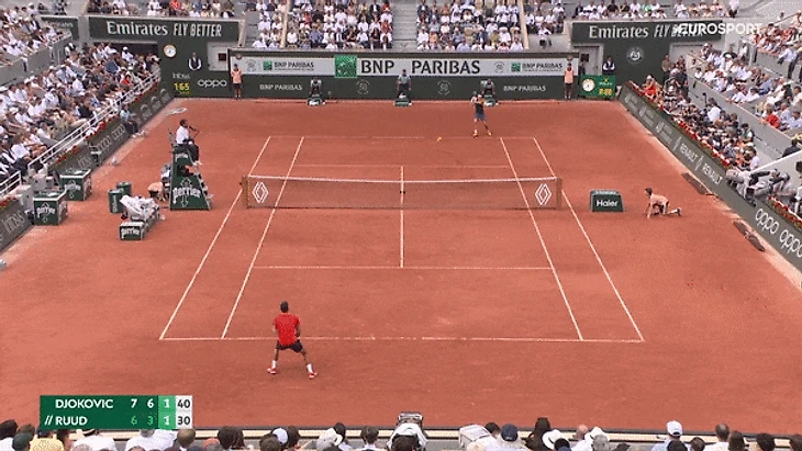 Рууд забрал подачу под ноль. Джокович дважды бросал дропшоты, но один в сетку, а на втором потом плохо бросил свечу.