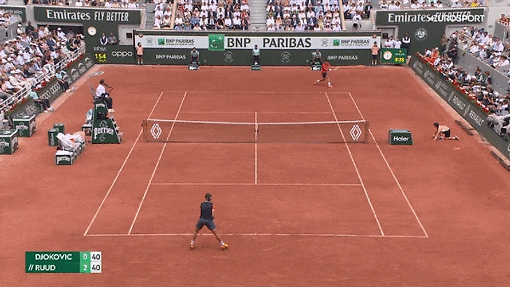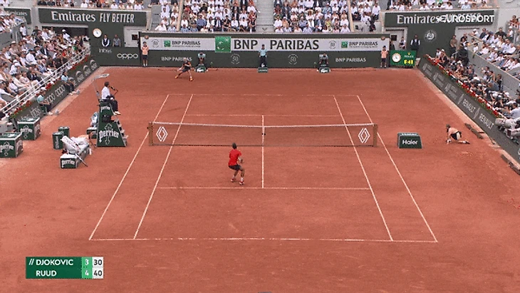 40:40 – Рууд очень агрессивно пробил бэкхенд, вышел к сетке и закрыл. Джоковича уже не было на корте – он упал, отвечая на бэкхенд.