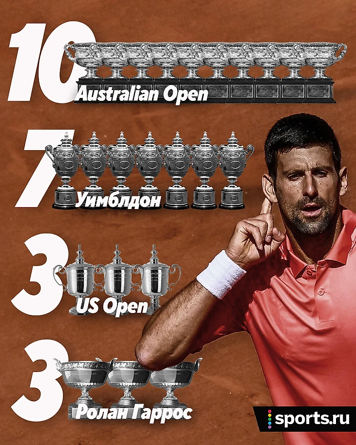 • Они с Надалем – единственные мужчины, бравшие отдельный ТБШ 10 и более раз. У Джоковича 10 титулов на Australian Open, у Надаля – 14 на «Ролан Гаррос».