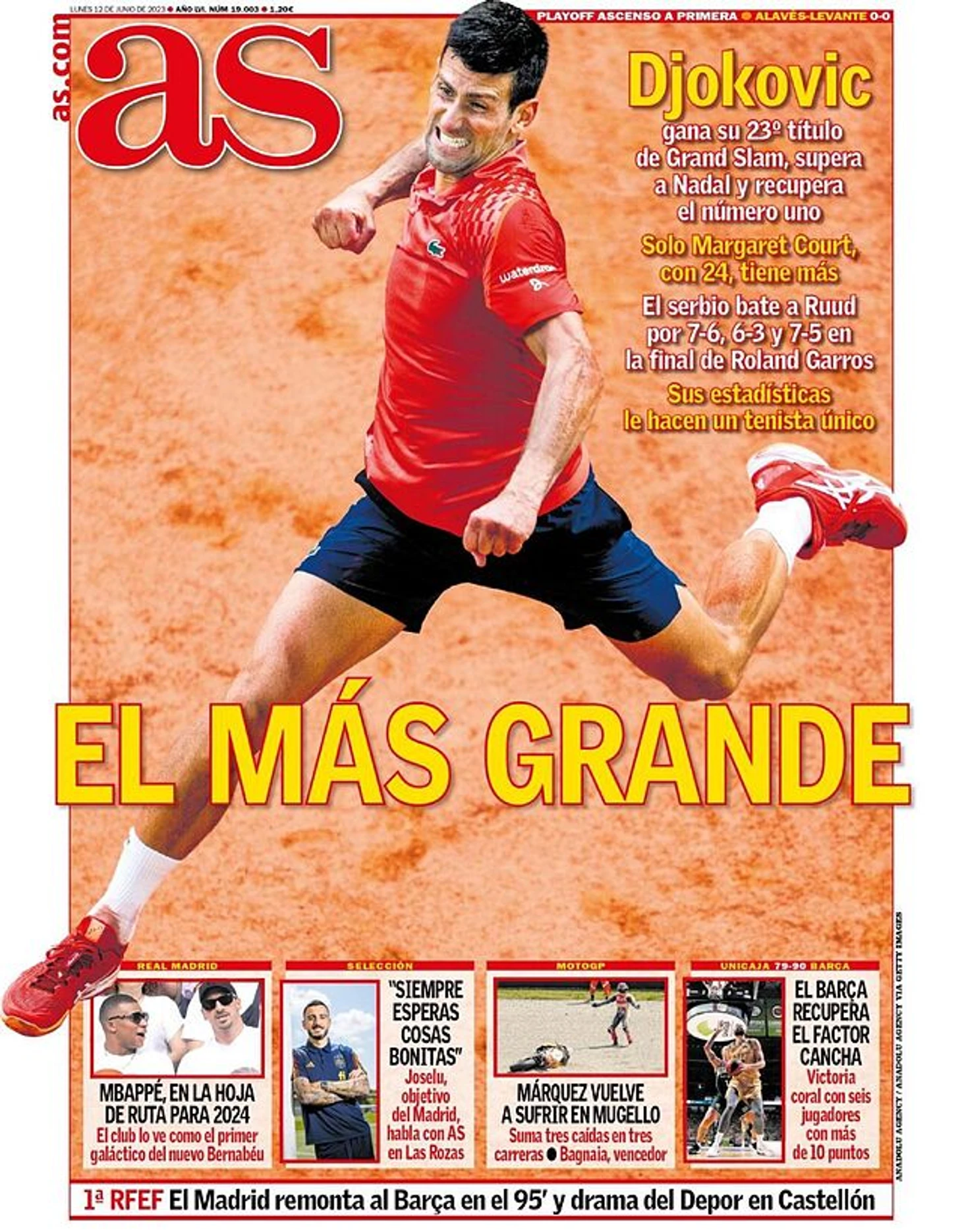 Величайший. Джокович выигрывает свой 23-й титул "Большого шлема", обгоняет Надаля и возвращает себе первое место в рейтинге. Больше только у Маргарет Корт - 24. Серб победил Рууда со счетом 7-6, 6-3, 7-5 в финале "Ролан Гаррос". Его статистика делает его уникальным теннисистом.