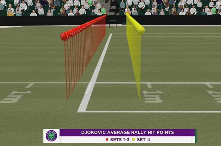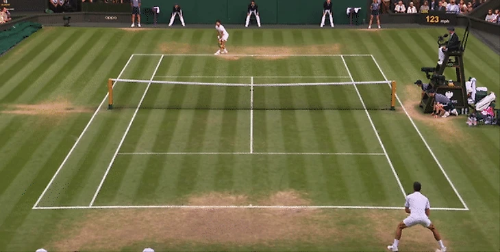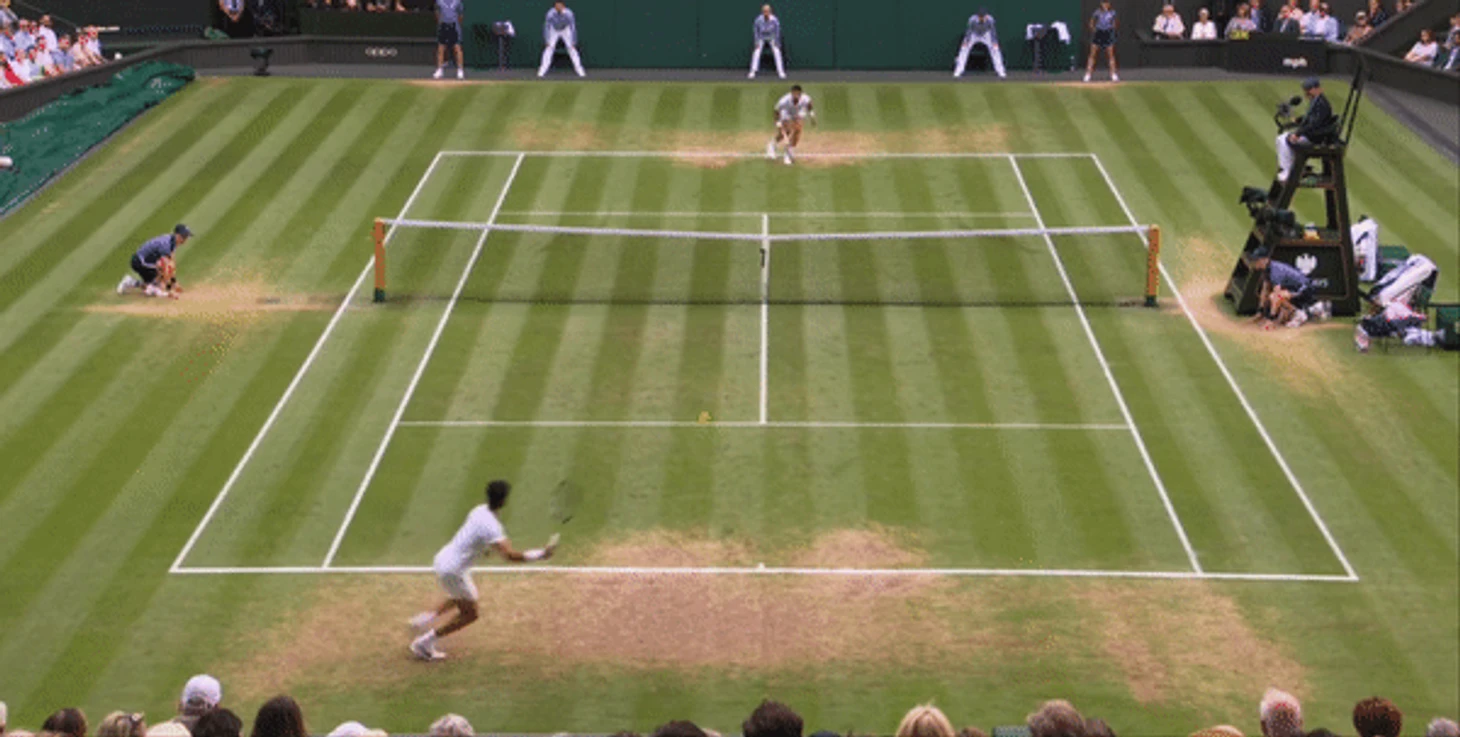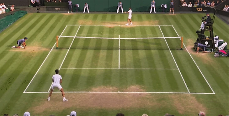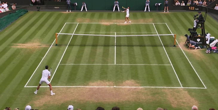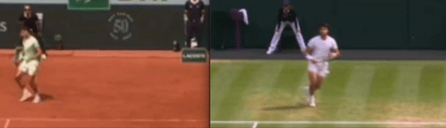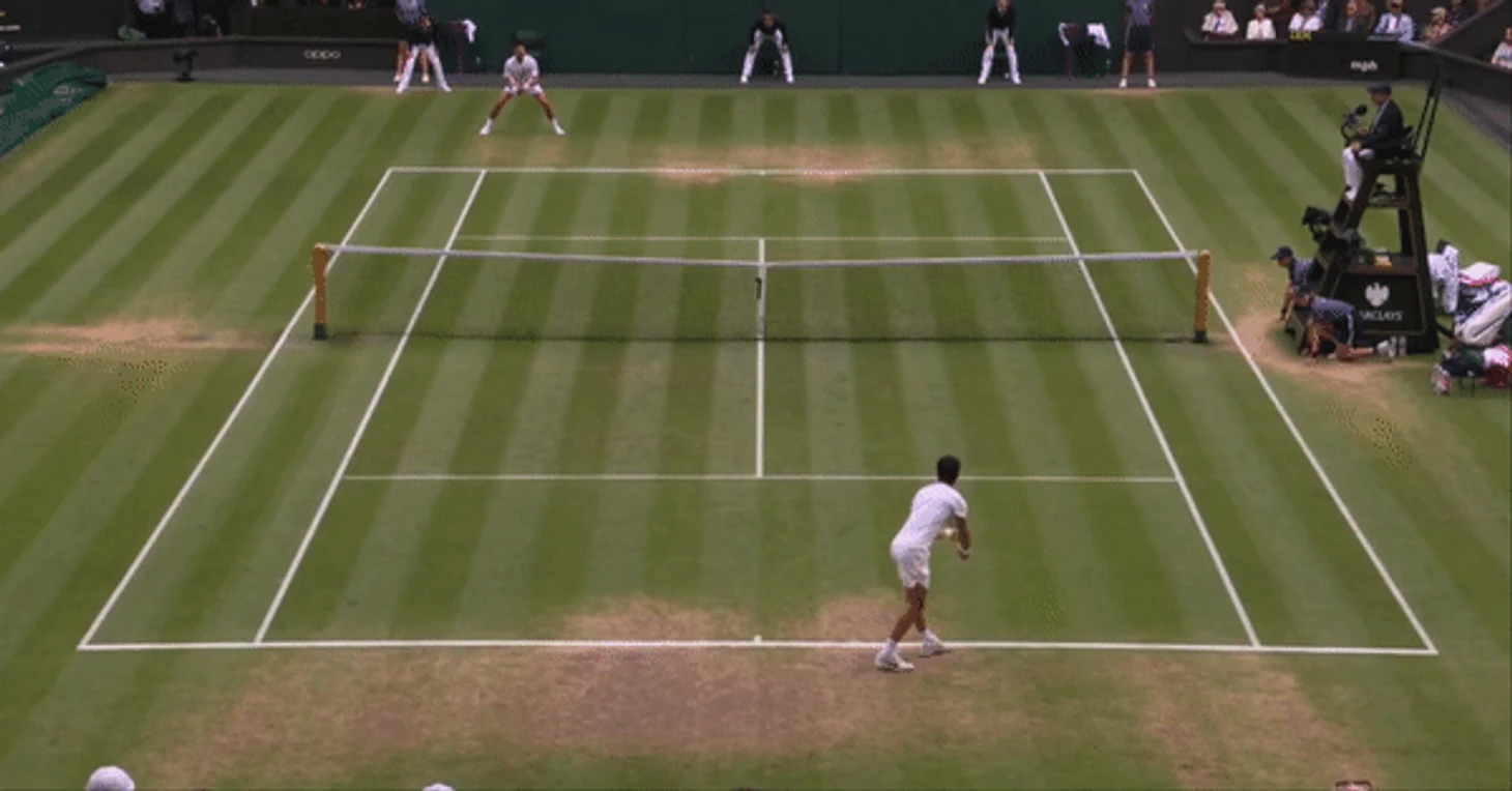 Обратите внимание, как Карлос выполняет удар с хода на траве. При классическом ударе справа сперва «загружается» правая нога, которая дает импульс и толчок, благодаря которому игрок наносит сильный удар, используя массу своего тела. Здесь же он начинает удар уже с левой ноги. Данный прием позволяет создавать больше вращения за счет поворота всего тела при ударе. Поскольку Новак применял уже упомянутую выше тактику форхенда, Алькарас просто не успевал подготовиться к быстрой смене направления удара, следуя «классическим» канонам и то, что мы видим на ролике справа отлично иллюстрирует то, как Алькарас адаптировал свою технику к более быстрой и низкой траве. Здесь мы видим, что он готов принять мяч и просто отправляет его обратно в игру, а оставаясь после удара на левой ноге он остается в «приседе» и сохраняет подвижность верхней части тела. Акцент делается на выверенности времени для удара, а не его мощи. И в результате Карлос действовал сзади гораздо плотнее, чем во время их матча на Roland Garros. Как итог, в матче Алькарас совершил меньшее количество ошибок при ударе справа, чем Джокович, несмотря на более атакующую игру.