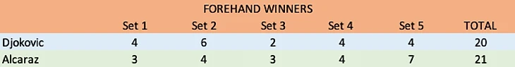 Алькарас также переиграл Новака по ударам слева навылет 11 против 7. Но допустил на 2 невынужденные больше. В соревновании эйсов также праздновал победу Алькарас: 9-2
