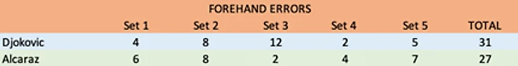 В пятом сете заработали и фирменные дропшоты испанца. В первых четырех сетах удачным был лишь 1 из 6. Только за пятый сет Карлос удачно укоротил 5 из 6 ударов. В отличие от большинства игроков, Алькарас укорачивает справа, прекрасно маскируя свой удар. Укороченные справа могут оказывать негативное влияние на стандартный удар, но не у Карлоса. Это отлично показывает, насколько Карлос уверен в своем форхенде, который к пятому сету и не думал терять своей мощи: