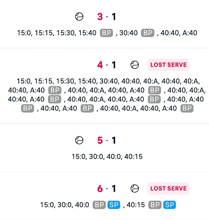 При счете 2:2 Алькарас упустил отличную возможность сделать счет 40:15 на своей подаче, ошибившись при ударе с лета. Мяч кажется сравнительно легким, но в динамике легко ошибиться на таком ударе при движении вперед и слишком сильном разгоне ракетки: