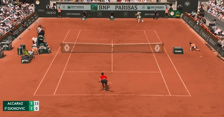 В следующем же гейме Джокович не допустил подобной ошибки и, казалось, решил продолжить матч с той точки, на которой закончился их предыдущий в Париже: со скоростного форхенда по диагонали в движении: