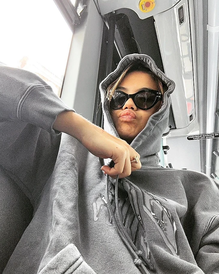 В комплекте к этому фото шли снимки того, как она каталась на простом автобусе – в капюшоне и темных очках, чтобы никто не узнал.