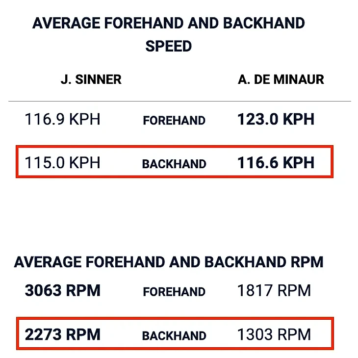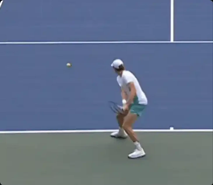 Для сравнения, разгон ракетки у Синнера заметно больше, что в совокупной работе с разворотом плеч и рук дает ему гораздо большую скорость при ударе.