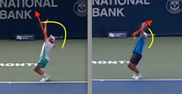 Если сравнивать подачу Синнера и Де Минора в моменте растяжки из одной и той же позиции, то мы можем увидеть насколько больше Янник отводит плечо назад, для создания «петли».