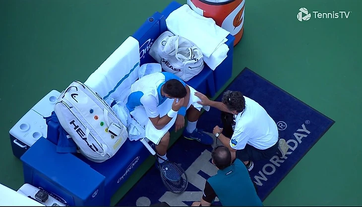 В этот момент Новак вызвал на корт врача, который после осмотра дал ему какие-то таблетки.
