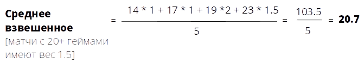 Если же мы, по какой-то причине придаем матчам, в которых было сыграно более 20 геймов, больший вес, например, 1.5, то среднее арифметическое перестанет быть равным среднему взвешенному.