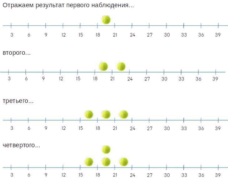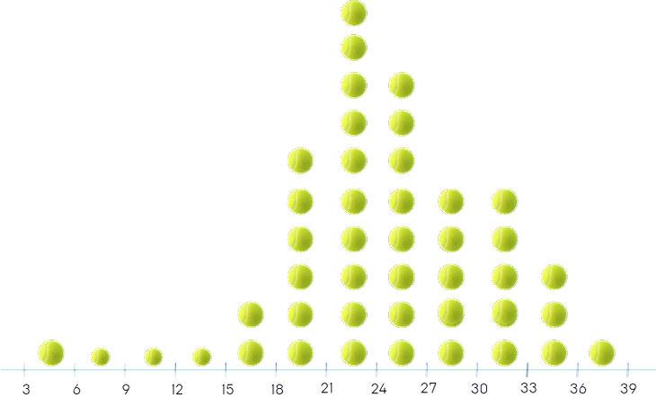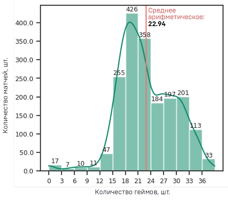 Вернемся к началу и занесем оставшиеся наблюдения. Примерно так, в схематичном виде, будет выглядеть наша гистограмма числа геймов, сыгранных в матчах тура в этом году.