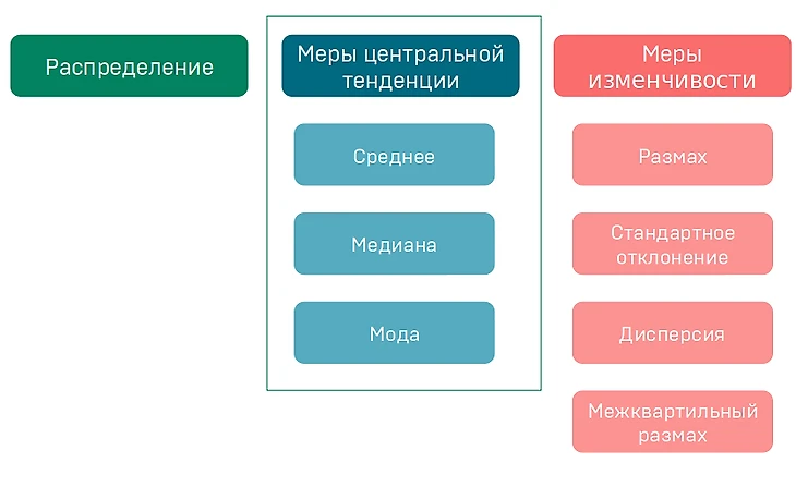 Вернемся к нашей теме. Описательные статистики принято разделять на три категории: распределение, меры центральной тенденции, меры изменчивости.
