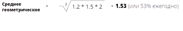 Чтобы высчитать среднее арифметическое необходимо перемножить значения прироста (в нашем случае 20% или 1.2, 50% или 1.5 и 100% или 2), а затем из полученного результата извлечь корень, степень которого равняется их количеству, в нашем случае 3.