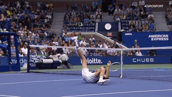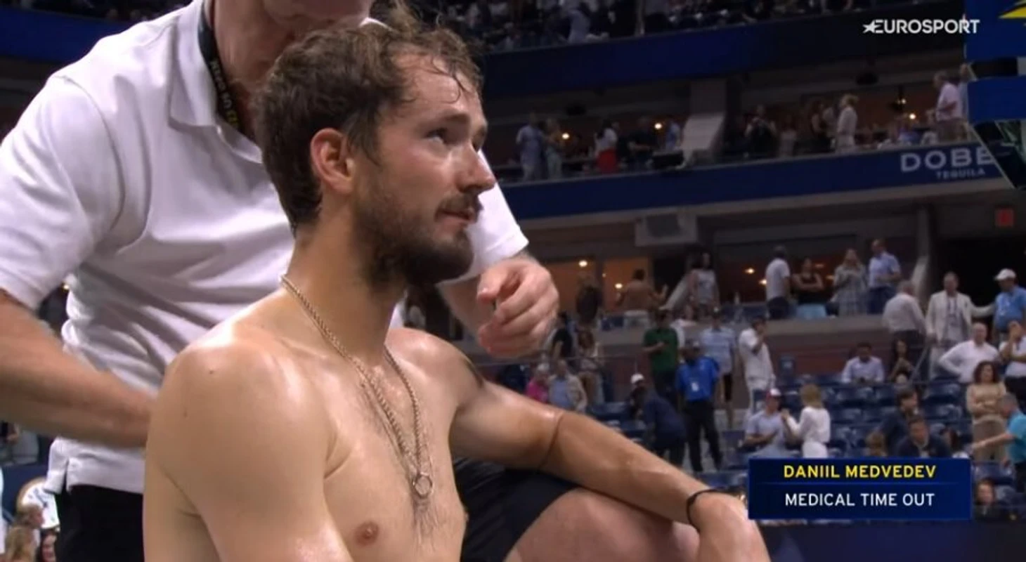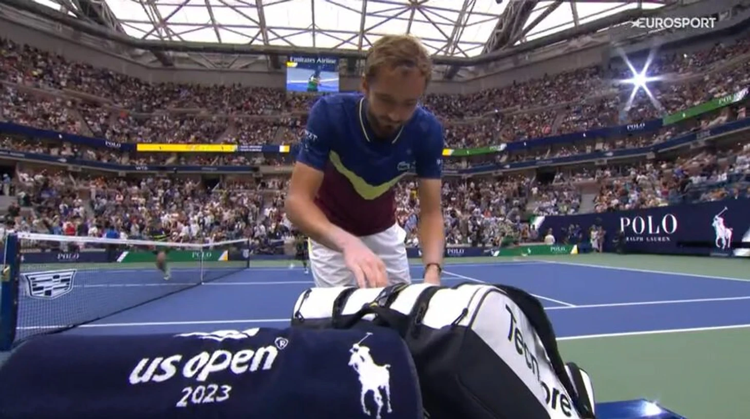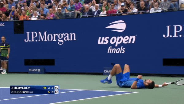 При счете 15:15 парни провели пока что самый длинный розыгрыш матча. Медведев отлично держал оборону, Джокович пошел на перевод слева по линии и ошибся в сетку. А потом как будто споткнулся.
