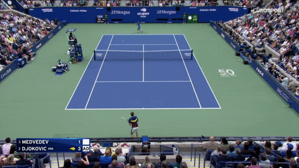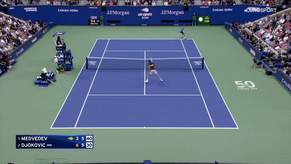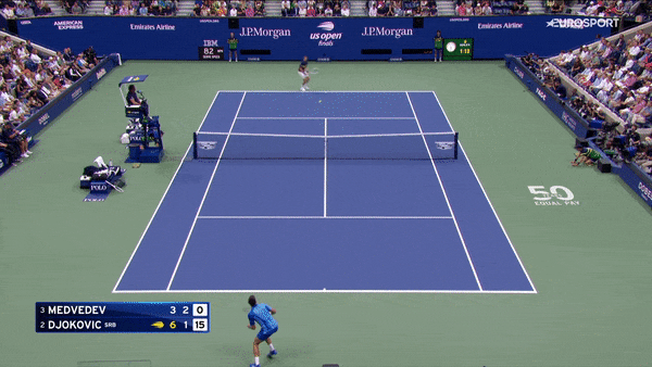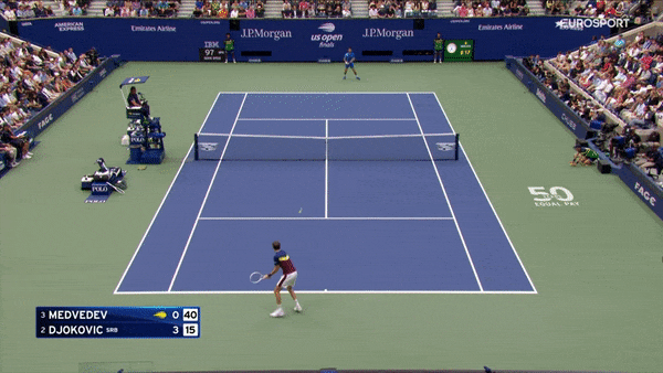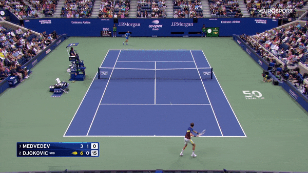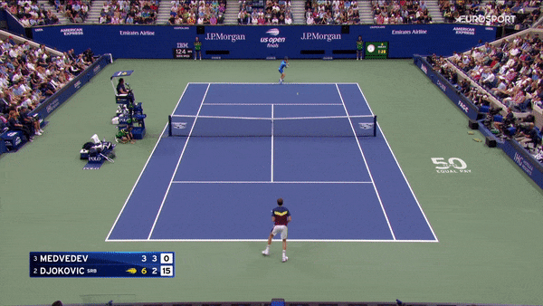 Первый розыгрыш гейма, Джокович кинул короткий мяч, Медведев догнал и забил слева.