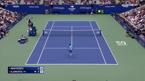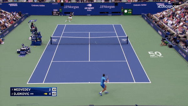 2:0* – очень активный розыгрыш от Новака, завершил его хлестким форхендом в боковую линию с короткого мяча. Медведев достал, но не обработал.