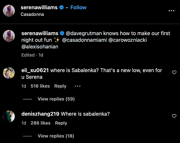 Серена Уильямс попала в мини-скандал, обрезав на фото в соцсетях белорусскую теннисистку Арину Соболенко.
