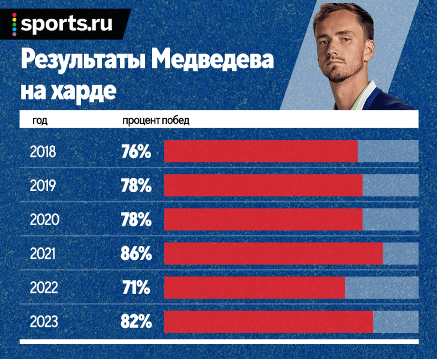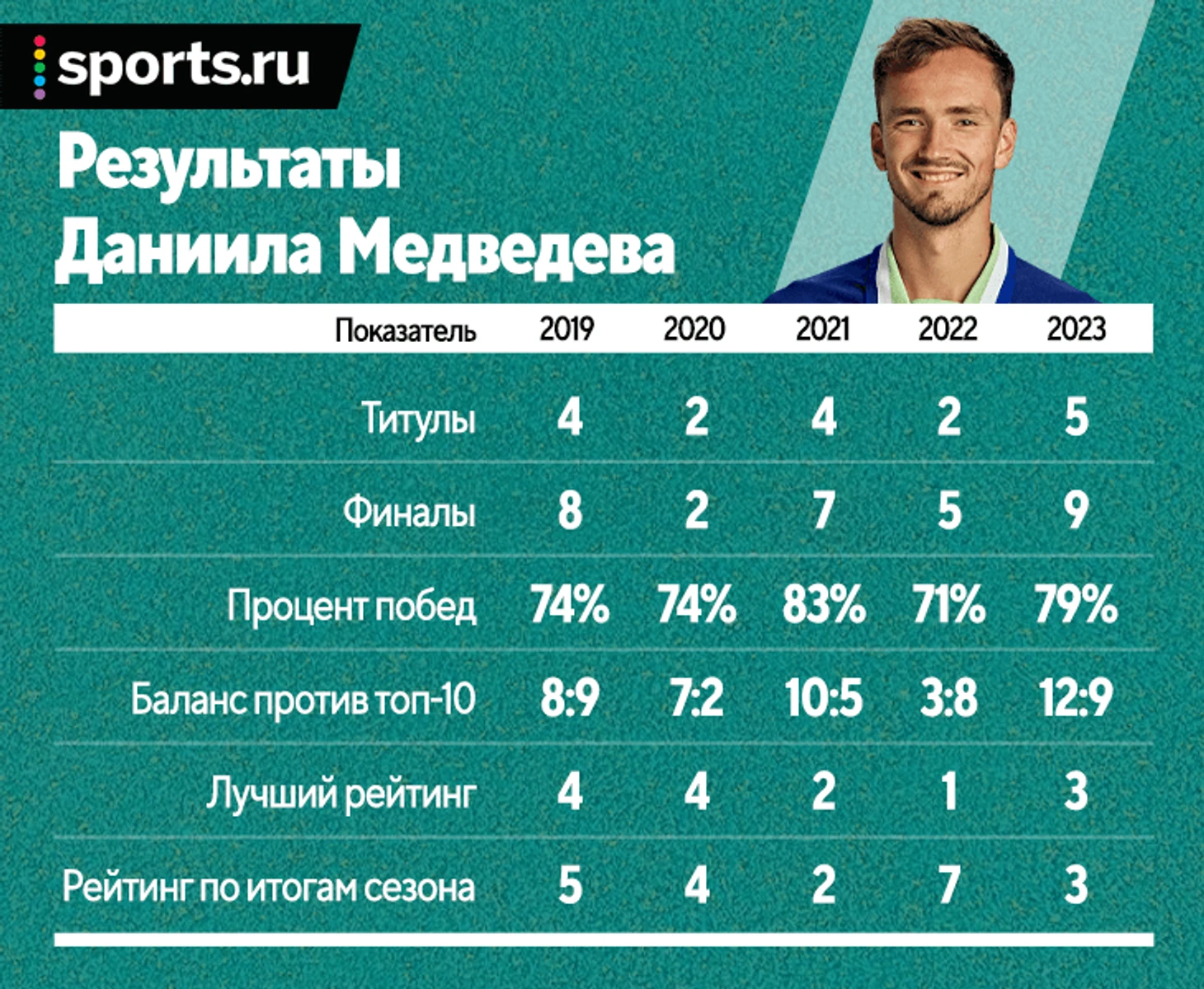 Да, в этом году процент побед у него хуже, чем в 2021-м и в матчах с топ-10 он выступал чуть слабее. Но Медведев провел больше всего финалов и выиграл рекордное для себя количество титулов. Он никогда не выигрывал за год столько матчей против топ-10 (12) и топ-20 (27), как в 2023-м. И в целом у него 66 побед – тоже максимум за карьеру.