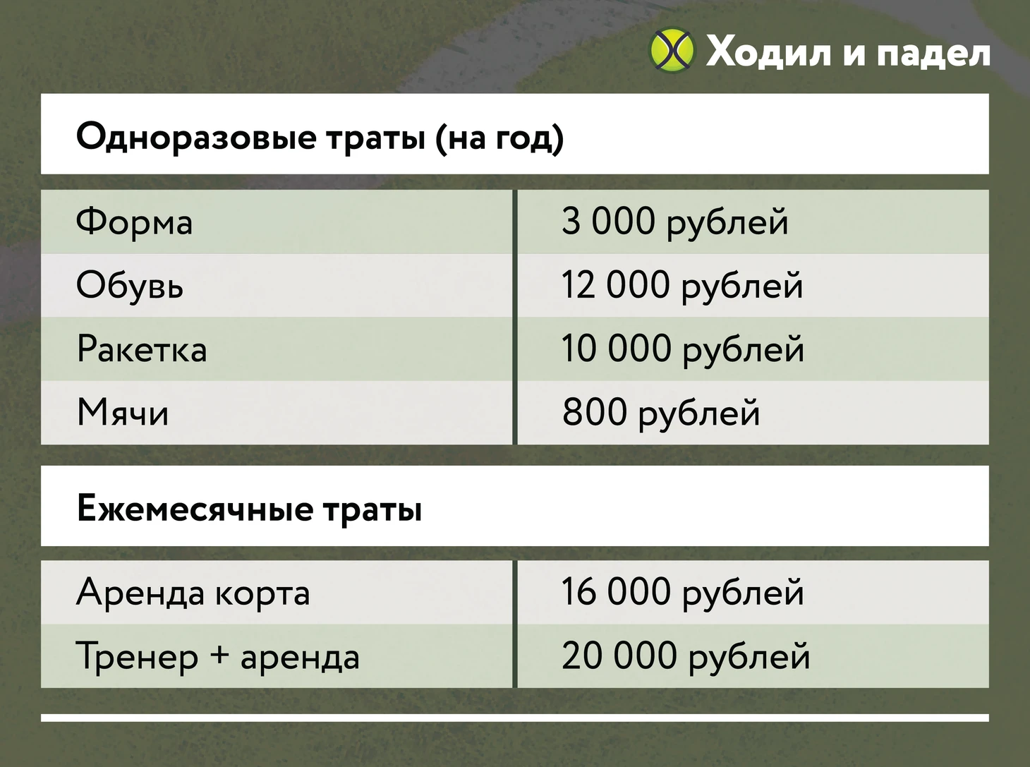 Но если вы захотите заниматься с тренером, а также купить собственную ракетку и специальную форму, в первый месяц можете потратить около 60 000 рублей.