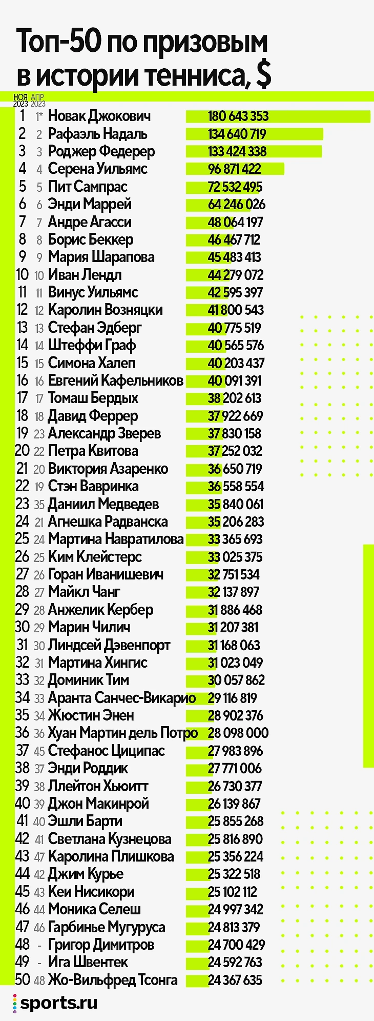 Мы уже публиковали подобный рейтинг в апреле. Тогда мы посчитали топ-50 с учетом инфляции – для завершивших карьеру игроков брали последний год в туре и высчитывали, какая получилась бы сумма.