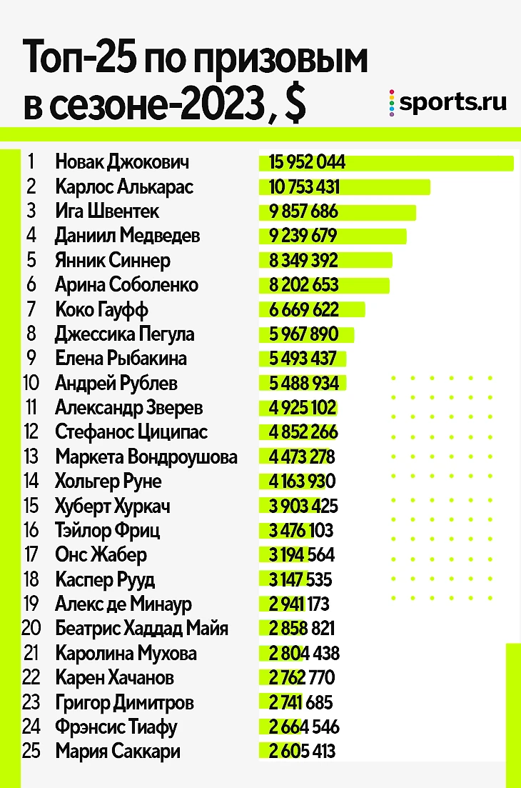 Теннисный сезон-2023 по факту завершился, так что самое время посчитать деньги – кто и сколько призовых заработал.