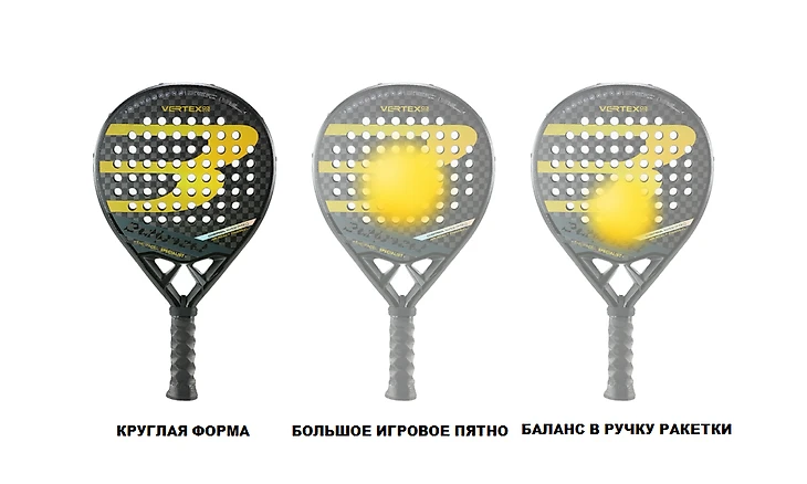 Ракетки с круглой формой, как правило, имеют смещенный в ручку баланс ракетки, что позволяет значительно повысить управляемость и избежать лишнего риска травм. Помимо этого, у таких ракеток игровое пятно расширено более всего среди трех форм и расположено по центру ракетки (игровым пятном называется та область ракетки, при попадании в которую получается наиболее качественный удар). Такие ракетки благодаря своей универсальности подойдут как профессиональным игрокам любящим высокий контроль, так и всем начинающим любителям, для более комфортного чувства мяча на начальных этапах игры особенно.