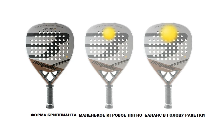 Модели ракеток фирмы Bullpadel с алмазной формой: Hack 03, Hack 03 Fip, Hack 03 Comfort, Vertex 03, Vertex 03 Comfort, Vertex 03 Women, Ionic Power, K2 Power, Indiga Power, Hack 03 Junior, Vertex 03 Junior, Vertex 03 Women Junior