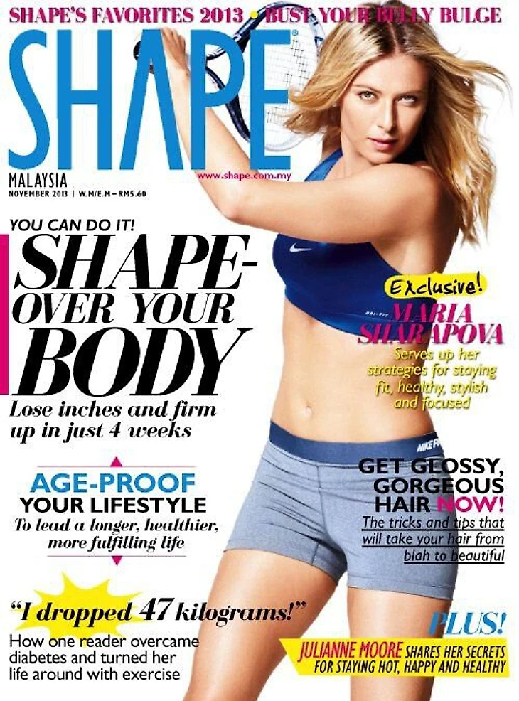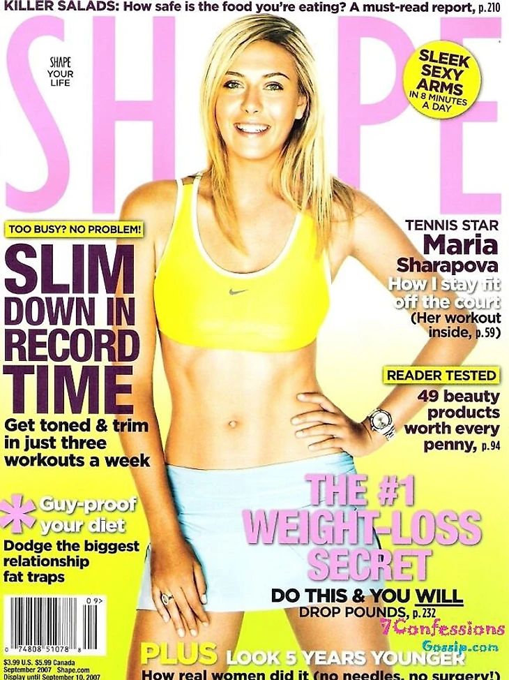Несколько раз в нулевые и начале 2010-х Шарапова снялась для обложек журнала Shape, обещавших разные секреты спортивной формы (на первой в 2007-м совсем не похожа на себя).