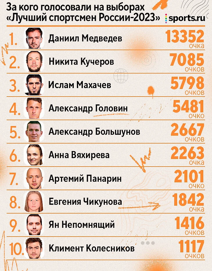💥 2937 пользователей поставили на первое место Даниила Медведева, 1287 – Ислама Махачева, 1016 – Никиту Кучерова, 784 – Александра Головина, 299 – Анну Вяхиреву, 220 – Евгению Чикунову, 183 – Артемия Панарина, 134 – Магомеда Collapse Халилова и Софью Акатьеву, 129 – Яна Непомнящего, 102 – Игоря Акинфеева, 100 – Климента Колесникова.