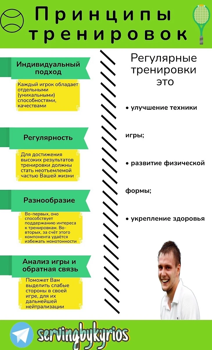 — Анализ игры и обратная связь. Это принцип при построении тренировочного процесса поможет Вам выделить слабые стороны в своей игре, для их дальнейшей нейтрализации. Очень важно выстроить грамотное взаимодействие со своим тренером/партнёром по тренировочному корту. Самоанализ игры вещь необходимая и даже нужная, но всё же иногда без стороннего вмешательства бывает сложно трезво оценивать себя и свои возможности.