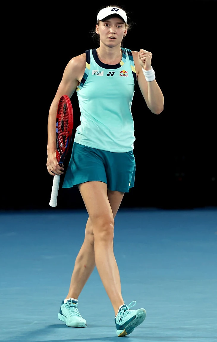 Также в голубом нескольких оттенков провела турнир прошлогодняя финалистка Елена Рыбакина, ее спонсор – Yonex.