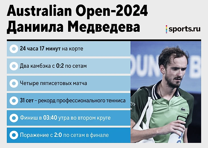 Финал против Янника Синнера Медведев снова проиграл с 2:0 по партиям – как и два года назад против Рафаэля Надаля. Это душераздирающее поражение за 3 часа 44 минуты не дало ему завоевать второй «Шлем», а время на корте Australian Open-2024 довело до 24 часов.