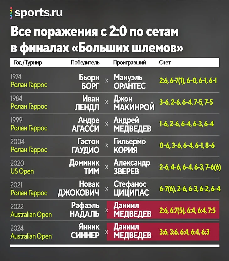 Медведев первым дважды упустил 2:0 по сетам в финалах «Шлемов». В истории лишь восемь случаев