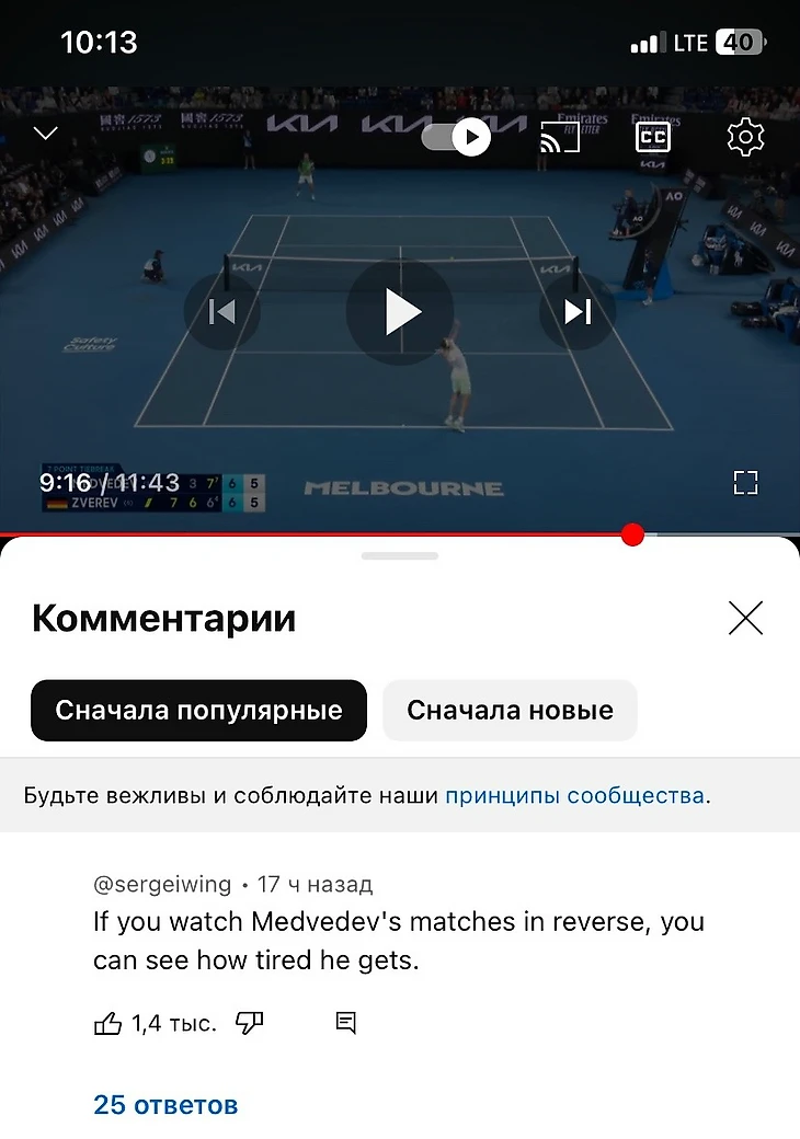 Однако вечером мне снова пришла весточка из теннисного раздела, в которой чёрным по белому было сказано, что кто-то перевёл мой комментарий на английский язык и опубликовал его под обзором матча на YouTube.