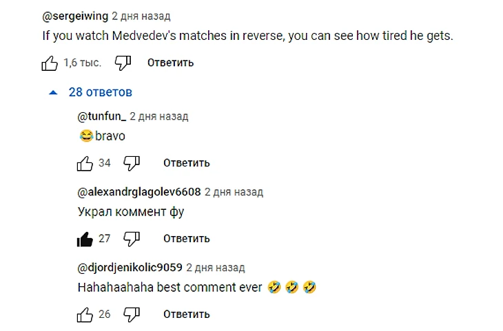 Матч был увлекательным и упорным. Изначально Александр сминал Даниила и игра казалась очевидной, однако российский феникс восстал из пепла, проигрывая 0:2 по сетам. Именно загадочная история Медведева мне и бросилась в глаза — в начале матча Даниил был уже вымотанным и медленным, тогда как в конце он выделялся сухостью и бодростью на фоне вспотевшего Александра. В конечном счёте россиянин победил 3:2 и прошёл в финал турнира, а я же примерно через 10 минут после игры на самом популярном российском спортивном сайте продублировал комментарий, который оказался для теннисной аудитории не просто метким, а самым что ни на есть вирусным.