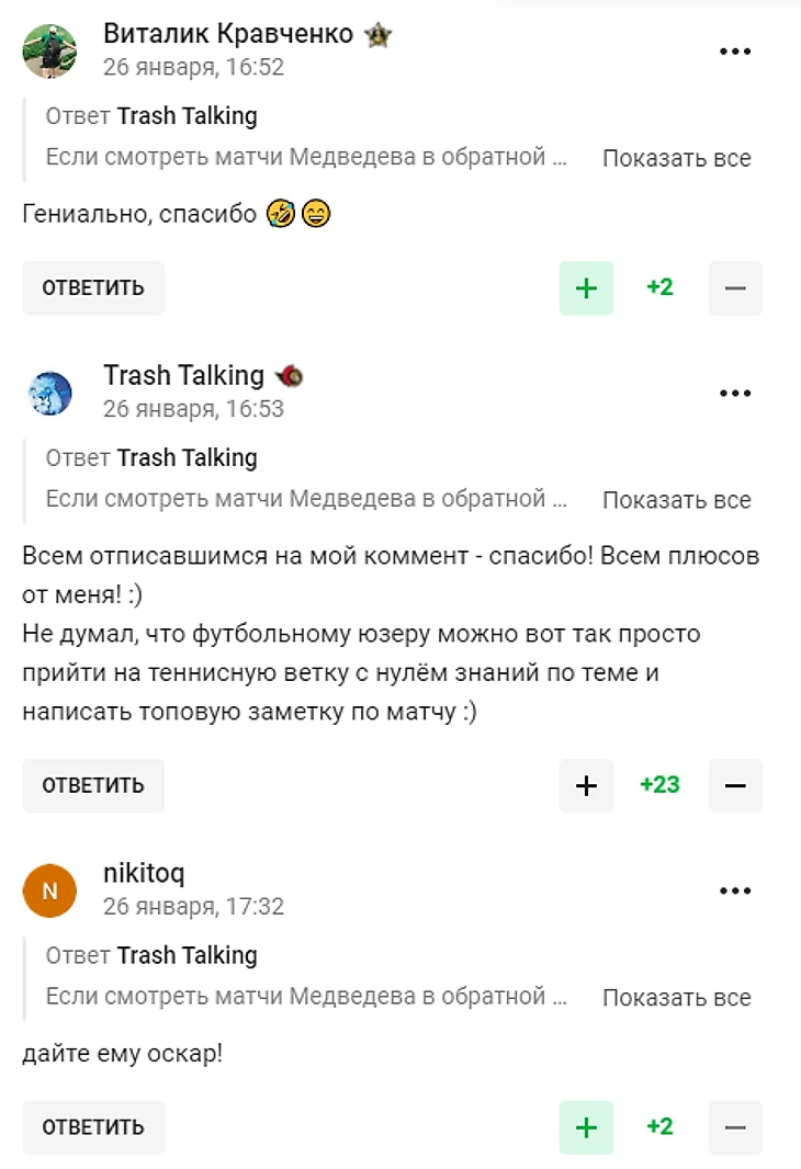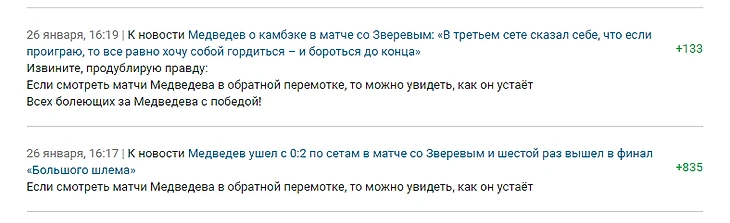 Далее я вернулся в привычный мне футбольный раздел сайта, при этом даже не подозревая, что в теннисном разделе пользователи залюбили мой комментарий и признали его чуть ли не самым гениальным в истории в контексте игр Даниила Медведева. Я не был готов к такому количеству восторгов в новой для меня среде, но не мог не поблагодарить отписавшихся людей за комплименты и одобрения, после чего снова вернулся к привычным мне футбольным новостям. Кстати, я был очень удивлён культуре теннисных пользователей — царящая доброта и вежливость, не идущая в пример с футбольными и фигурными баталиями.