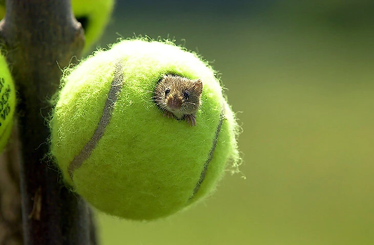 Про мышек - вы где таких мышей нашли чтобы они в теннисном мяче аж целое гнездо делали? Это не гандбольный мяч