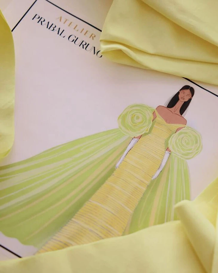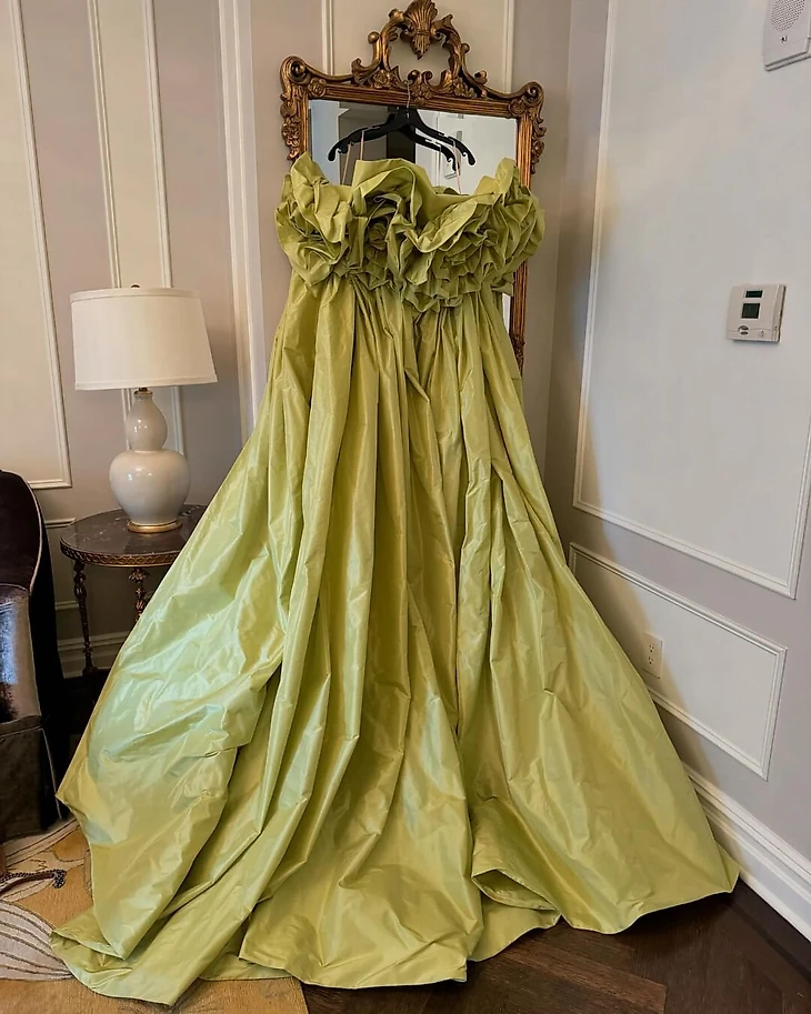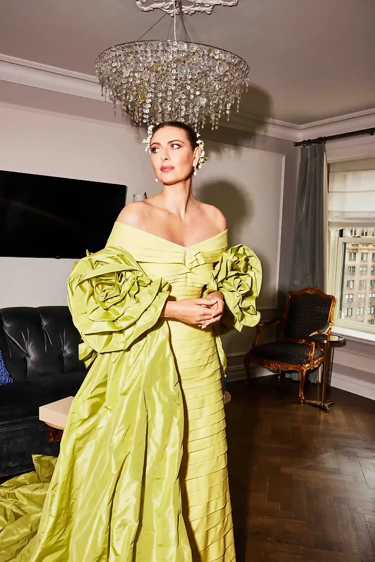 Платье Шараповой было создано специально для нее дизайнером Прабалом Гурунгом, основателем одноименного бренда, завсегдатая красных ковровых дорожек. Лимонно-лаймовый наряд вдохновлен не цветом теннисного мяча, а нарциссами и другими цветами и сшит из элитного хлопка, предоставленного маркой Boll & Branch, производящей постельное белье и одежду для сна. Хлопок – неочевидный выбор для вечернего платья, но Гурунг рассказал, что материал приятно удивил его «мягкостью, движением, текстурой».