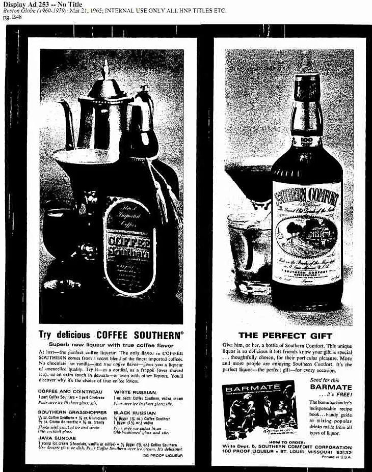 Первое известное упоминание коктейля «Белый русский» – «Черного», но со сливками – зафиксировано на рекламе новоорлеанского кофейного ликера, опубликованной в газете The Boston Globe в ноябре-1965. Кто придумал сливочный твист, неизвестно, но в подкасте The Art of Drinking предполагают, что это мог быть Донато «Герцог» Антон, легендарный миксолог послевоенной Америки. В первый список Международной ассоциации барменов, составленный в 1961-м, «Русские» не вошли, но вошли во второй в 1987-м.