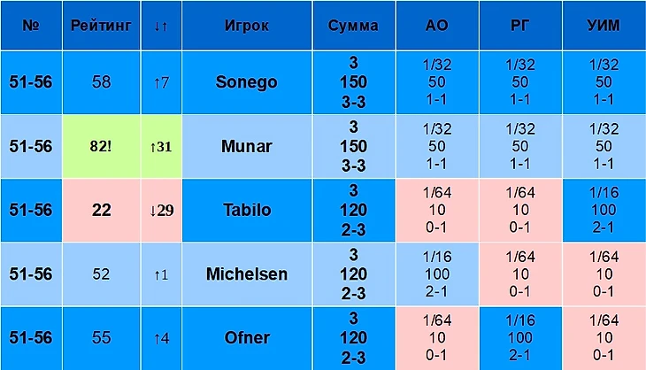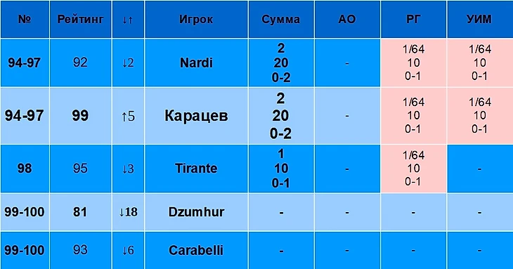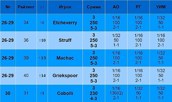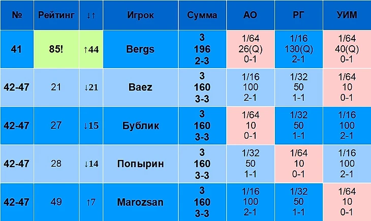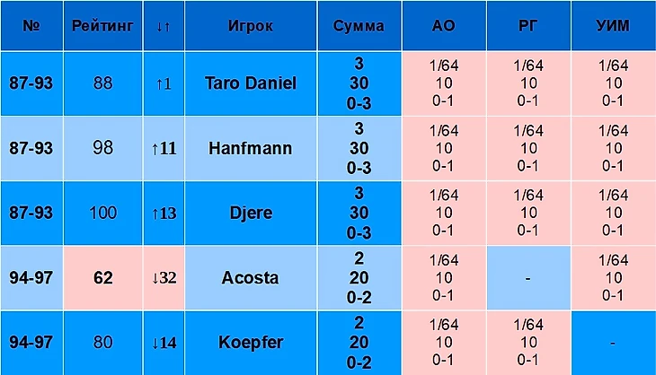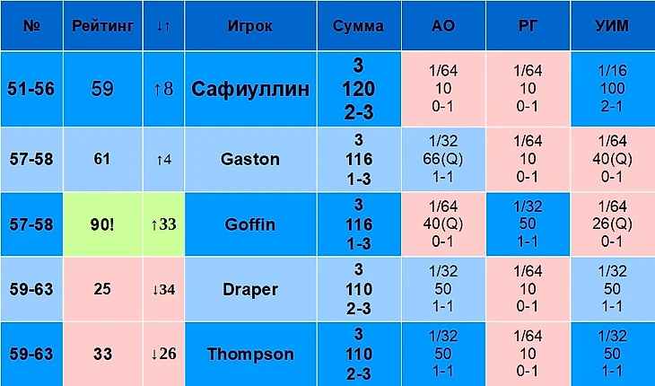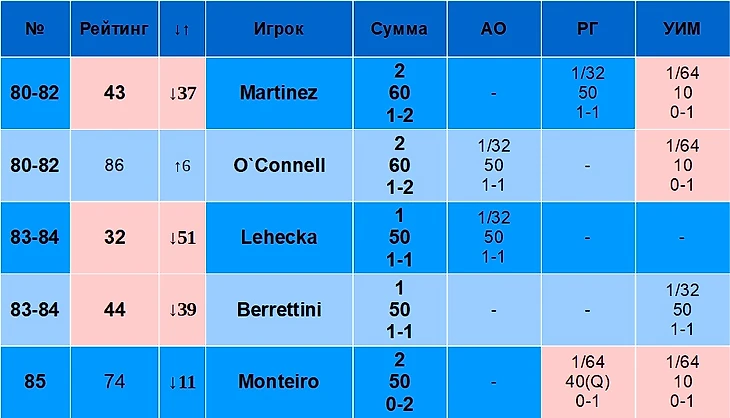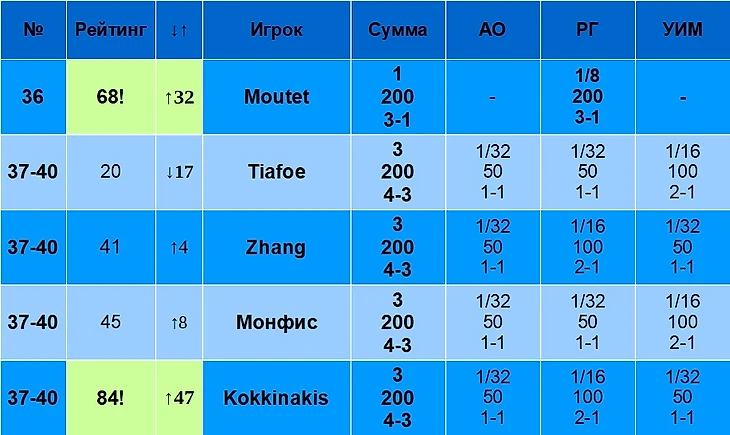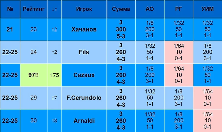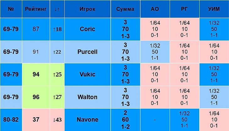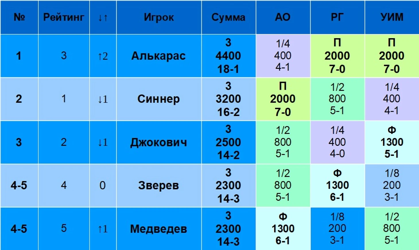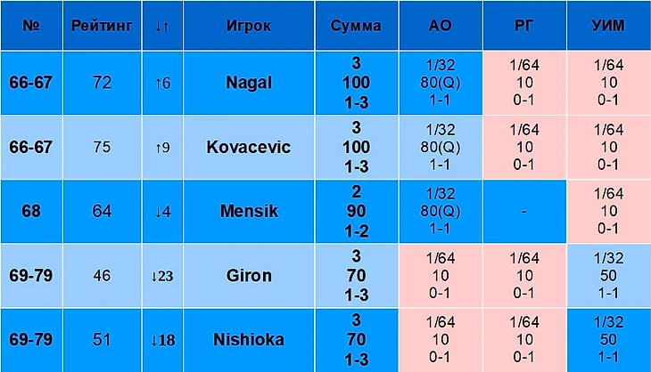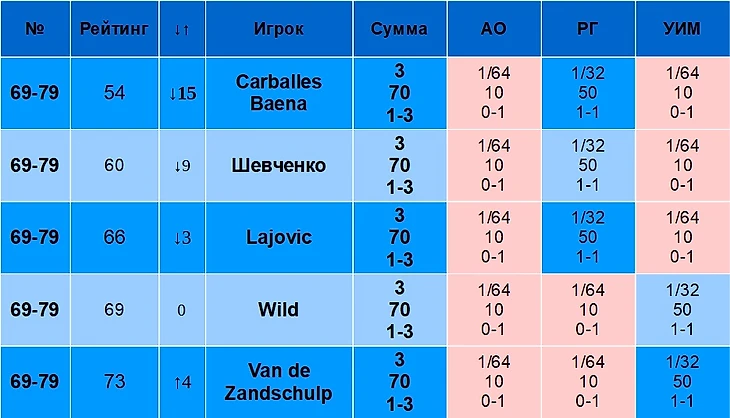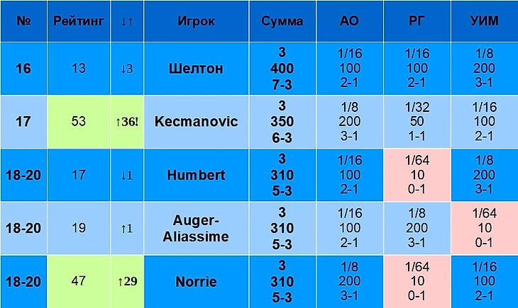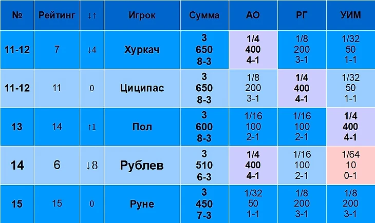 В столбце «Рейтинг» указан рейтинг игрока на 19 августа 2024 года. В столбце «↓↑» указано, лучше или хуже относительно своего рейтинга играет игрок именно на Шлемах. Например, Синнер – первый в рейтинге, но на Шлемах по сумме очков он только второй, поэтому у него «↓1». Алькарас, наоборот, только третий в рейтинге, но первый по сумме очков на Шлемах, поэтому у него «↑2».
