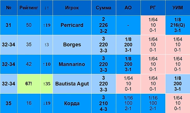Баутиста Агут тоже неплох на Шлемах для своего рейтинга, +35 позиций.