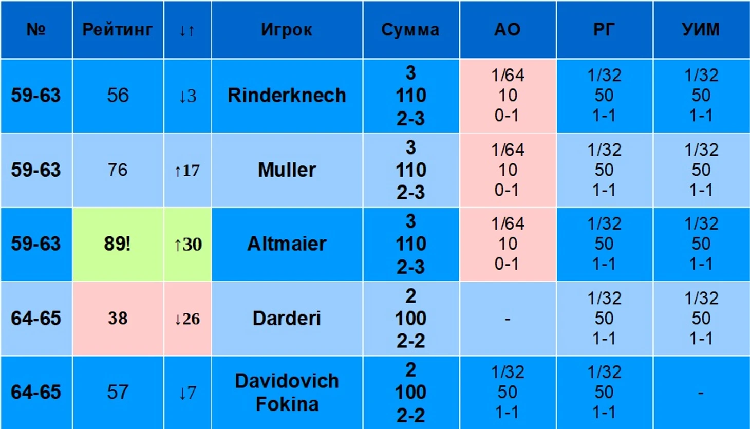 В столбце «Сумма» в каждой ячейке первая строчка – число участий в Шлемах в 2024, вторая – сумма очков, третья – соотношение побед и поражений. В столбцах «АО» – «УИМ», в каждой ячейке первая строчка – результат выступления игрока на данном Шлеме, вторая – очки за данное выступление, третья – соотношение побед и поражений на данном турнире.