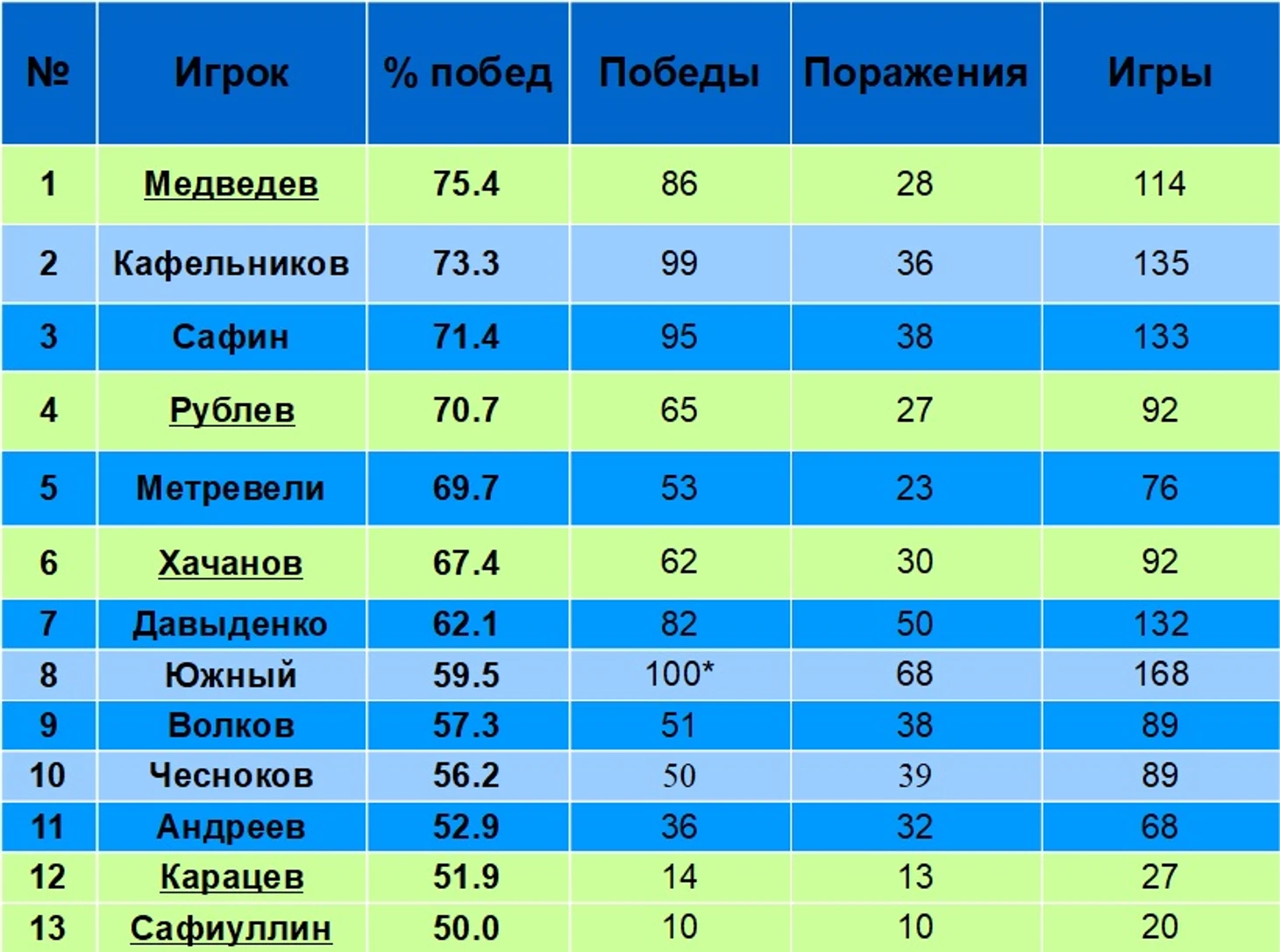 Также сделал отдельную таблицу, где расположил игроков в порядке убывания процента побед. Взял 13 игроков, у которых процент побед 50 и выше. Светло-зеленым отметил действующих игроков.